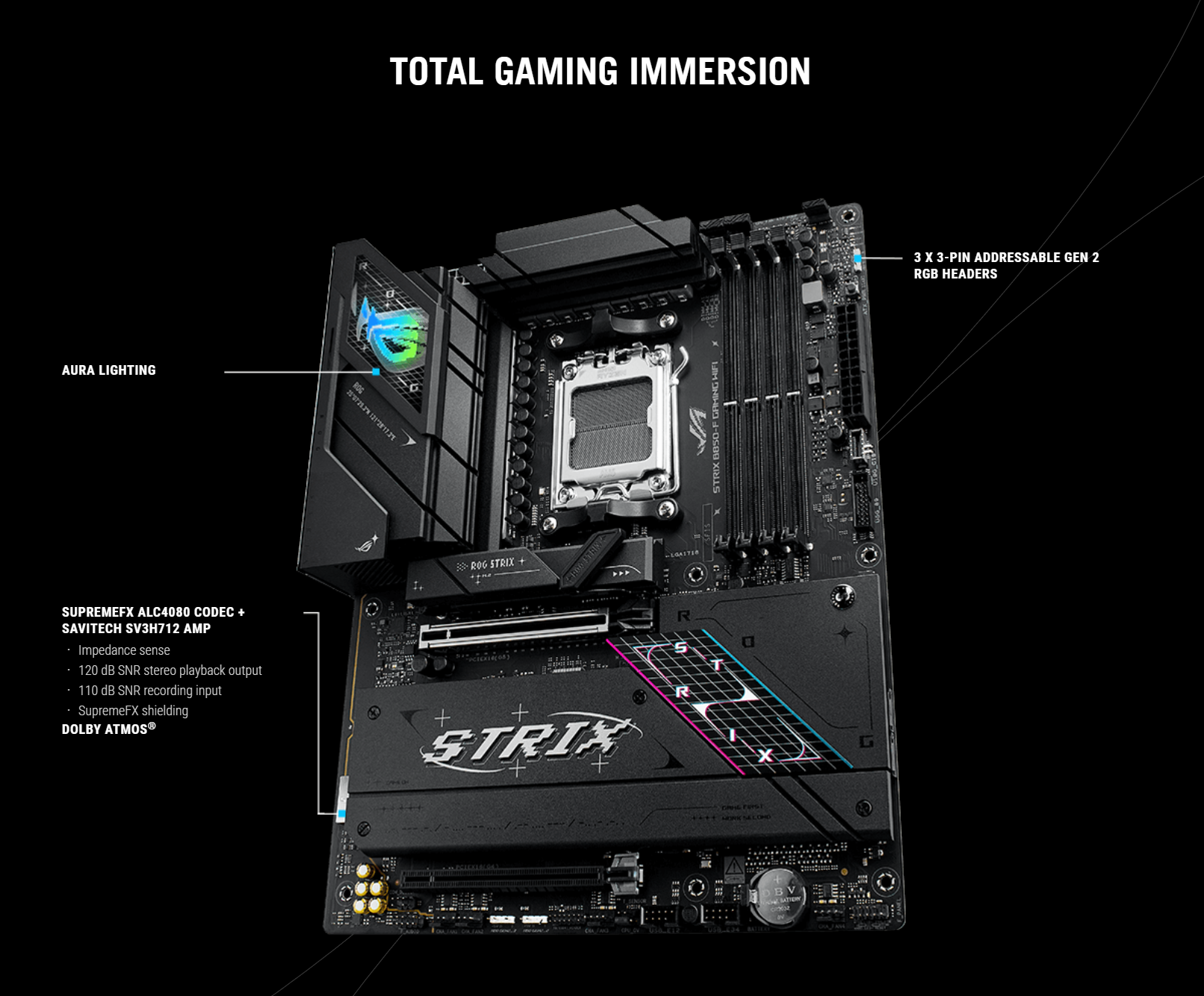 | Audio | ROG SupremeFX 7.1 Surround Sound High Definition Audio CODEC ALC4080* - Impedance sense for front and rear headphone outputs - Supports: Jack-detection, Multi-streaming, Front Panel MIC Jack-retasking - High quality 120 dB SNR stereo playback output and 110 dB SNR recording input - Supports up to 32-Bit/384 kHz playback on front panel Audio Features - SupremeFX Shielding Technology - Savitech SV3H712 AMP - Rear optical S/PDIF out port - Premium audio capacitors - Audio cover * A chassis with an HD audio module in the front panel is required to support 7.1 Surround Sound audio output. ** The LINE OUT port on the rear panel does not support spatial audio. If you wish to use spatial audio, make sure to connect your audio output device to the audio jack on the front panel of your chassis or use a USB interface audio device. |