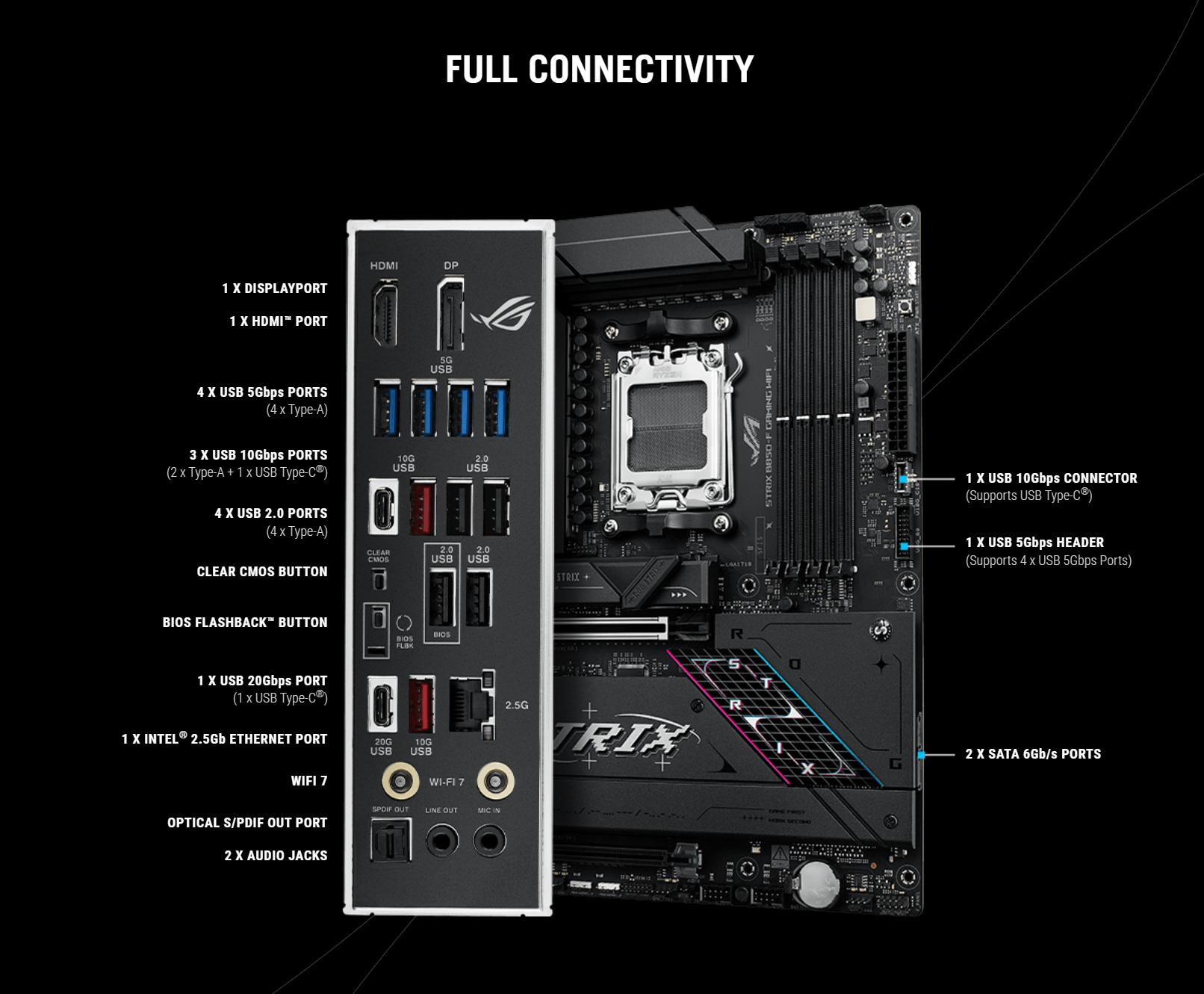 | Back Panel I/O Ports | 1 x USB 20Gbps port (1 x USB Type-C) 3 x USB 10Gbps ports (2 x Type-A + 1 x USB Type-C) 4 x USB 5Gbps ports (4 x Type-A) 4 x USB 2.0 ports (4 x Type-A) 1 x DisplayPort 1 x HDMI port 1 x Wi-Fi module 1 x Intel 2.5Gb Ethernet port 2 x Audio jacks 1 x Optical S/PDIF out port 1 x BIOS FlashBack button 1 x Clear CMOS button |