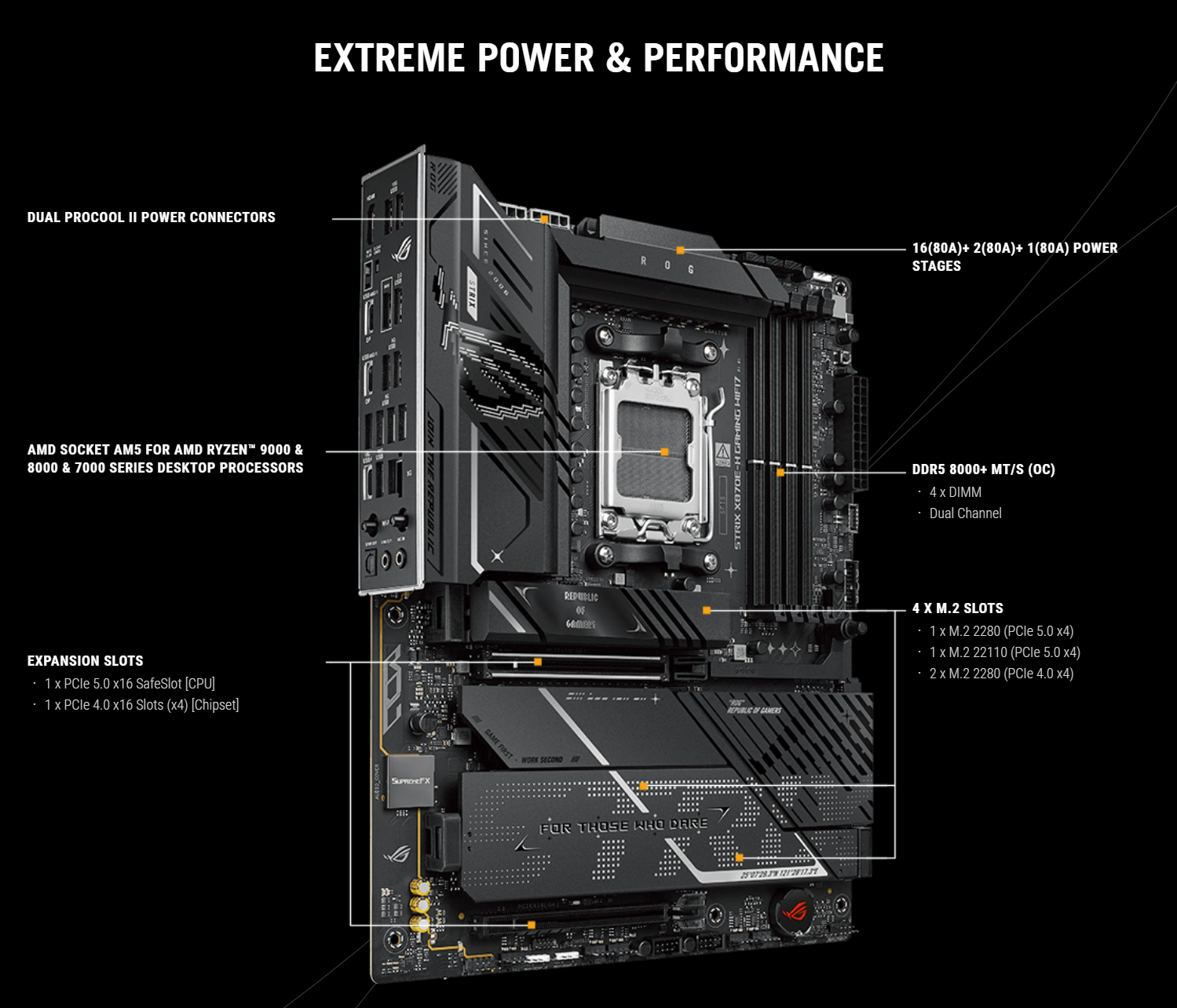 | Expansion Slots | AMD Ryzen 9000 & 7000 Series Desktop Processors* 1 x PCIe 5.0 x16 slot (supports x16 mode) AMD Ryzen 8000 Series Desktop Processors* 1 x PCIe 4.0 x16 slot (supports x8/x4 mode)** AMD X870E Chipset 1 x PCIe 4.0 x16 slot (supports x4 mode) * Please check the PCIe bifurcation table on the support site (https://www.asus.com/support/FAQ/1037507/). ** Specifications vary by CPU types. - To ensure compatibility of the device installed, please refer to https://www.asus.com/support/download-center/ for the list of supported peripherals. |
