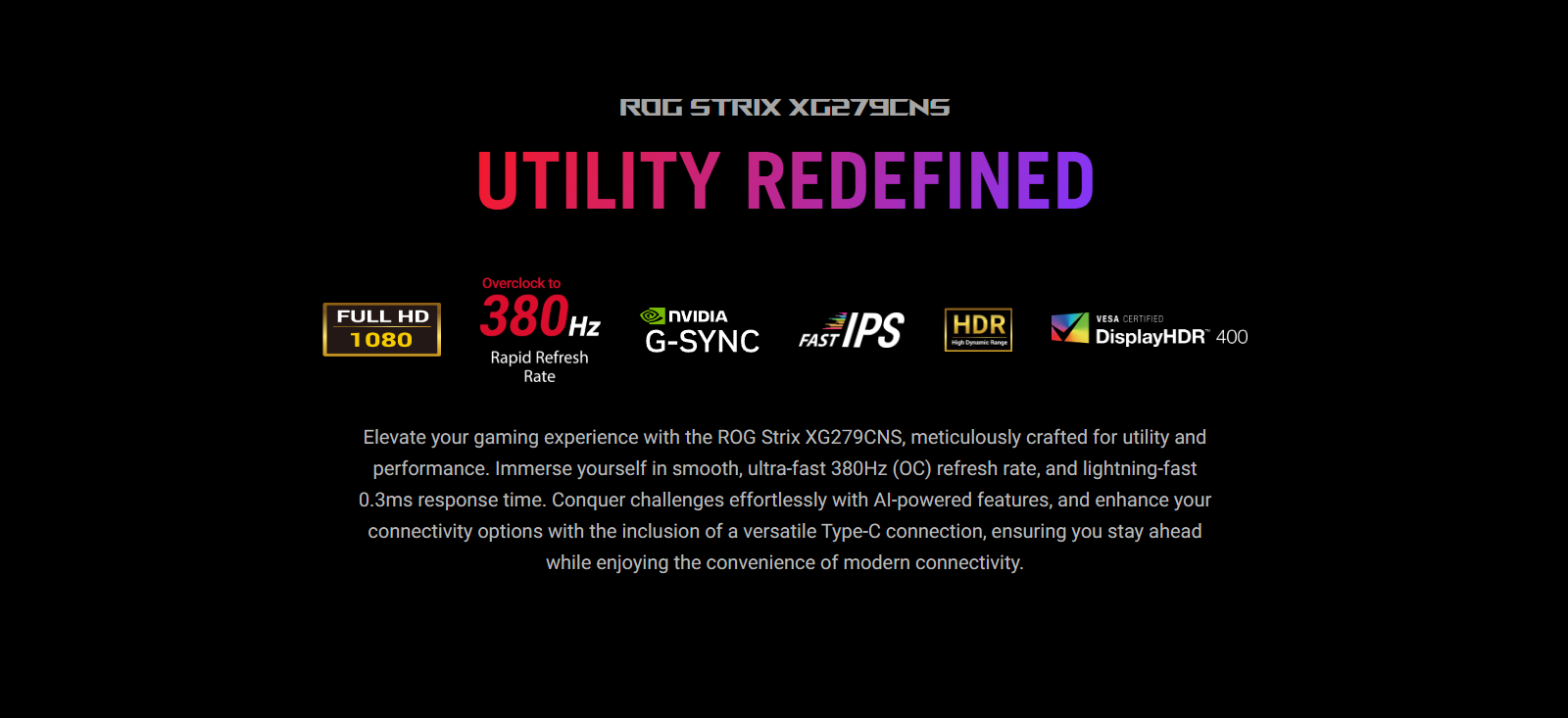 ROG Strix XG279CNS е 27-инчов Full HD (1920x1080) HDR гейминг монитор, създаден за професионални геймъри и потапящо игрово изживяване. Ето някои от ключовите му характеристики: