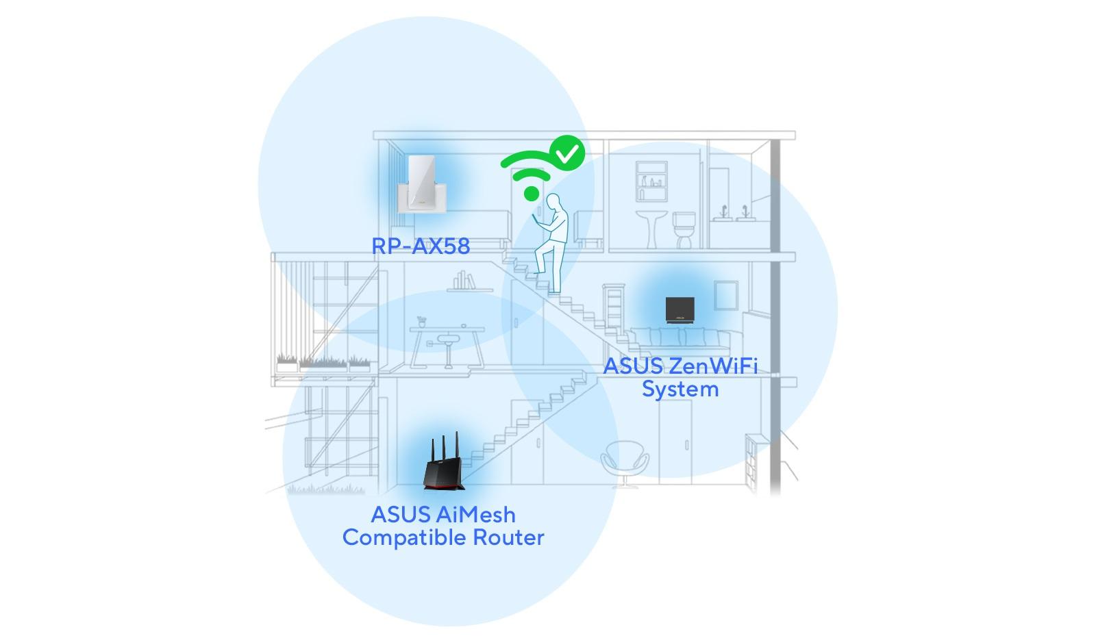 latency WiFi. With 160MHz bandwidth on 5GHz channels, RP-AX58 can double your surfing speed. - Extend Seamless AiMesh WiFi System -RP-AX58 supports AiMesh, which enables you to enjoy