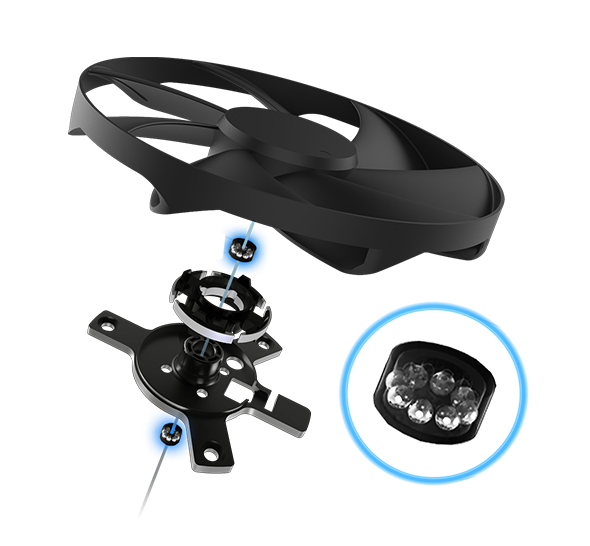 - Axial-tech fan design features a smaller fan hub that facilitates longer blades and a barrier ring that increases downward air pressure.