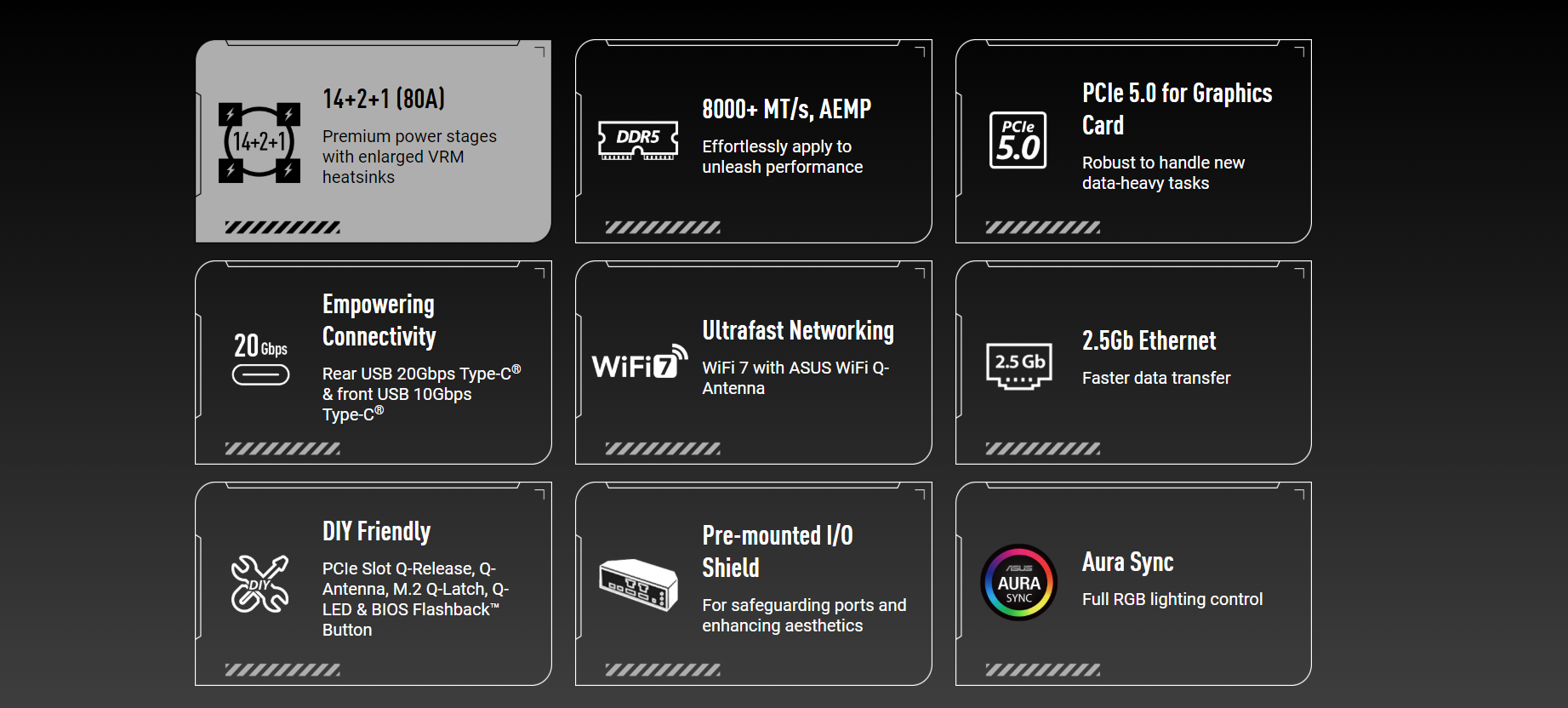 | Wireless & Bluetooth | Wi-Fi 7* 2x2 Wi-Fi 7 (802.11be) Supports 2.4/5/6GHz frequency band** Supports Wi-Fi 7 160MHz bandwidth, up to 2.9Gbps transfer rate Bluetooth v5.4*** * Wi-Fi features may vary depending on the operating system. For Windows 11, Wi-Fi 7 will require 24H2 or later version for full functions, Windows 11 21H2/22H2/23H2 only support Wi-Fi 6E. ** Wi-Fi 6GHz frequency band and bandwidth regulatory may vary between countries. *** The Bluetooth® version may vary, please refer to the Wi-Fi module manufacturer's website for the latest specifications. |