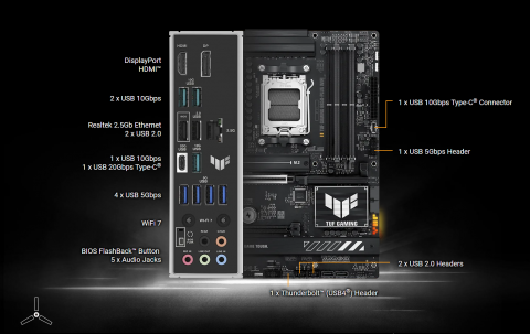 | Back Panel I/O Ports | 1 x USB 20Gbps port (1 x USB Type-C) 3 x USB 10Gbps ports (3 x Type-A) 4 x USB 5Gbps ports (4 x Type-A) 2 x USB 2.0 ports (2 x Type-A) 1 x DisplayPort 1 x HDMI port 1 x Wi-Fi module 1 x Realtek 2.5Gb Ethernet port 5 x Audio jacks 1 x BIOS FlashBack button |