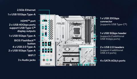 | Expansion Slots | AMD Ryzen 9000 & 7000 Series Desktop Processors* 1 x PCIe 5.0 x16 slot (supports x16 mode) AMD Ryzen 8000 Series Desktop Processors 1 x PCIe 4.0 x16 slot (supports x8/x4 mode)** AMD X870 Chipset 2 x PCIe 4.0 x16 slots (support x1 mode) 1 x PCIe 3.0 x16 slot (supports x1 mode)*** * Please check the PCIe bifurcation table on the support site (https://www.asus.com/support/FAQ/1037507/). ** Specifications vary by CPU types. *** PCIEX16(G3) slot shares bandwidth with SATA6G_3 and SATA6G_4 ports. Both SATA ports will be disabled when PCIEX16(G3) slot is running. You can enter the BIOS to adjust the default Settings as required. - To ensure compatibility of the device installed, please refer to https://www.asus.com/support/download-center/ for the list of supported peripherals. |