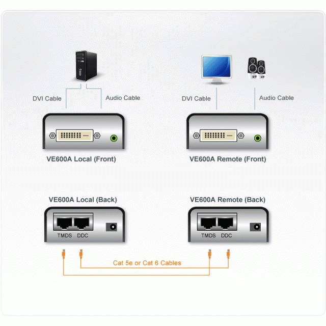 VE600A позволява изпращане на DVI видео сигнал плюс звук на разстояние до 60 метра от DVI източника през Cat 5e кабели.