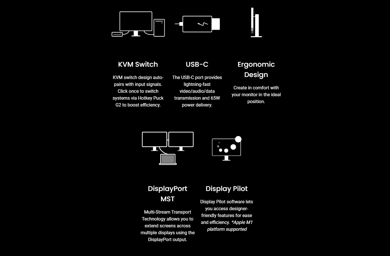 | Panel Type | IPS | Color Mode | Animation, CAD/CAM, Darkroom, DCI-P3, DICOM, Display P3, ePaper, HDR, Low Blue Light, M-Book, Rec.709, sRGB, User |