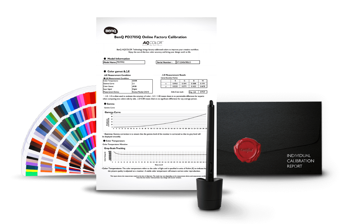 Have confidence in your color. Each BenQ PD2705Q arrives factory-calibrated with its unique calibration report.