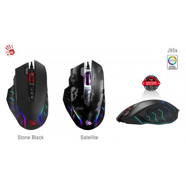 Bloody J95s е геймърска оптична мишка с до 8000 CPI и стандартен USB накрайник. Кабелът е плетен, гарантиращ максимална здравина и решава проблемът оплитане. Чрез софтуера на Bloody ще можете да настроите абсолютно всичко на вашата мишка. Оптичниият сензор предлага възможност за смяна на CPI в пет стъпки, като започва от 100 и стига до 8000, но със софтуерът на Bloody ще можете да персонализирате и това. Ще може да програмирате всеки един бутон на мишката, а RGB подсветката е разделена на 15 зони, като всяка e с индивидуална настройка, а имате и 5 фабрично заредени ефекта. С тази мишка ще вдигнете нивото на игралното поле и ще бъдете истинско страшилище за враговете.