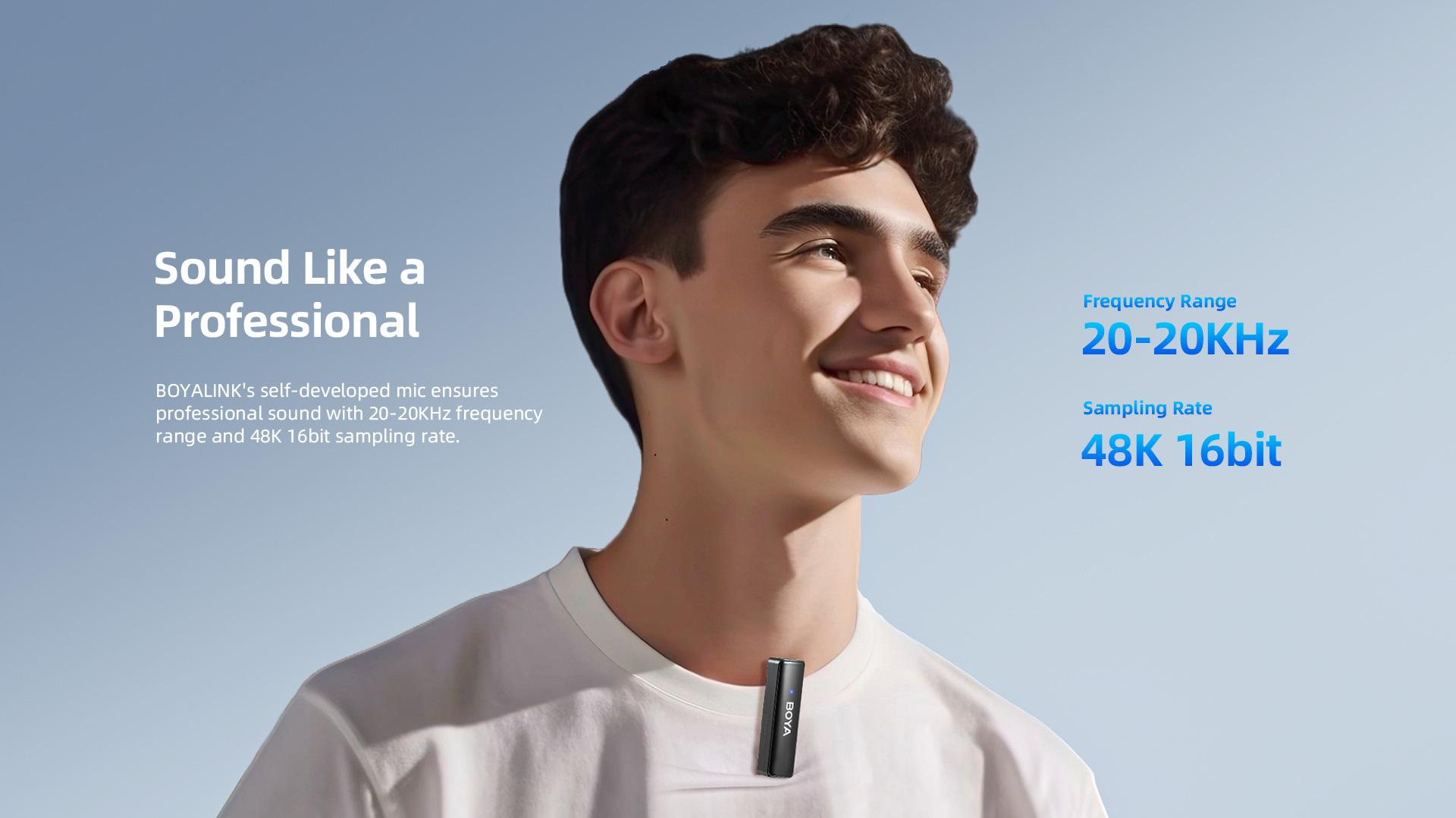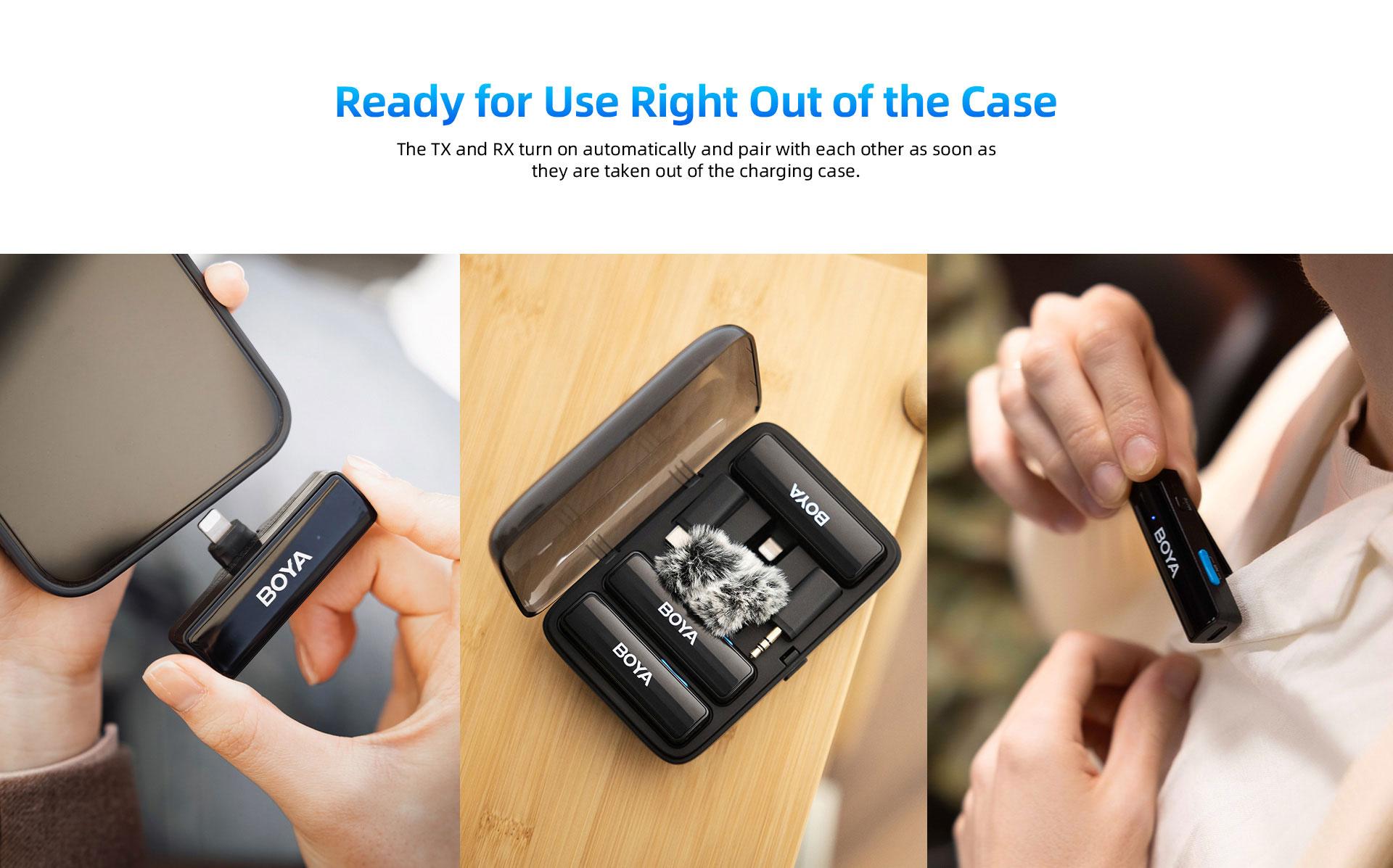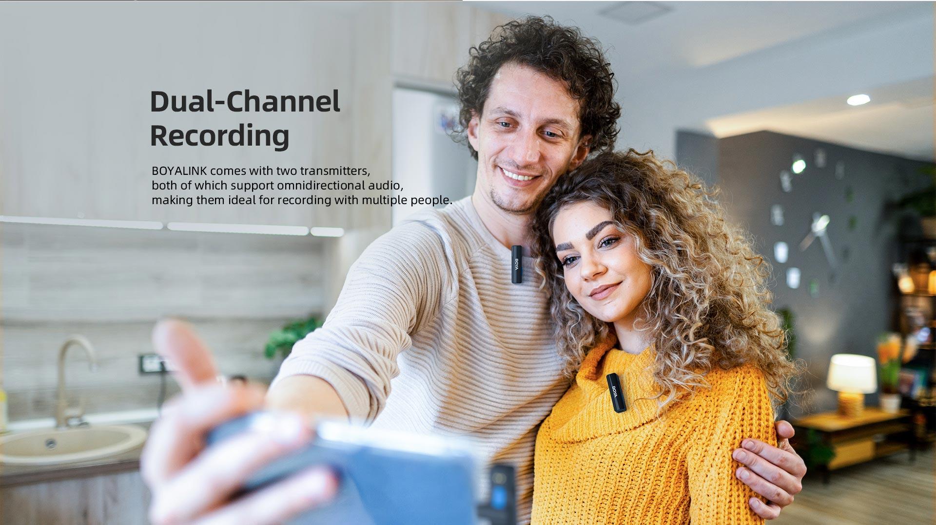 Product IntroductionBOYALINK is a wireless microphone system with dual 2.4G channels. Equipped with the USB-C, Lightning, and 3.5mm TRS connectors, BOYALINK is the ultimate solution for content creators who demand high-quality audio recording without the hassle of multiple connectors or adapters. Its all-in-one storage design, dual-channel wireless technology, and easy-to-use setup make it the ideal choice for anyone looking to take their audio recording to the next level. |