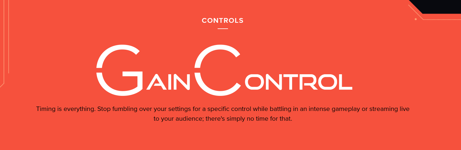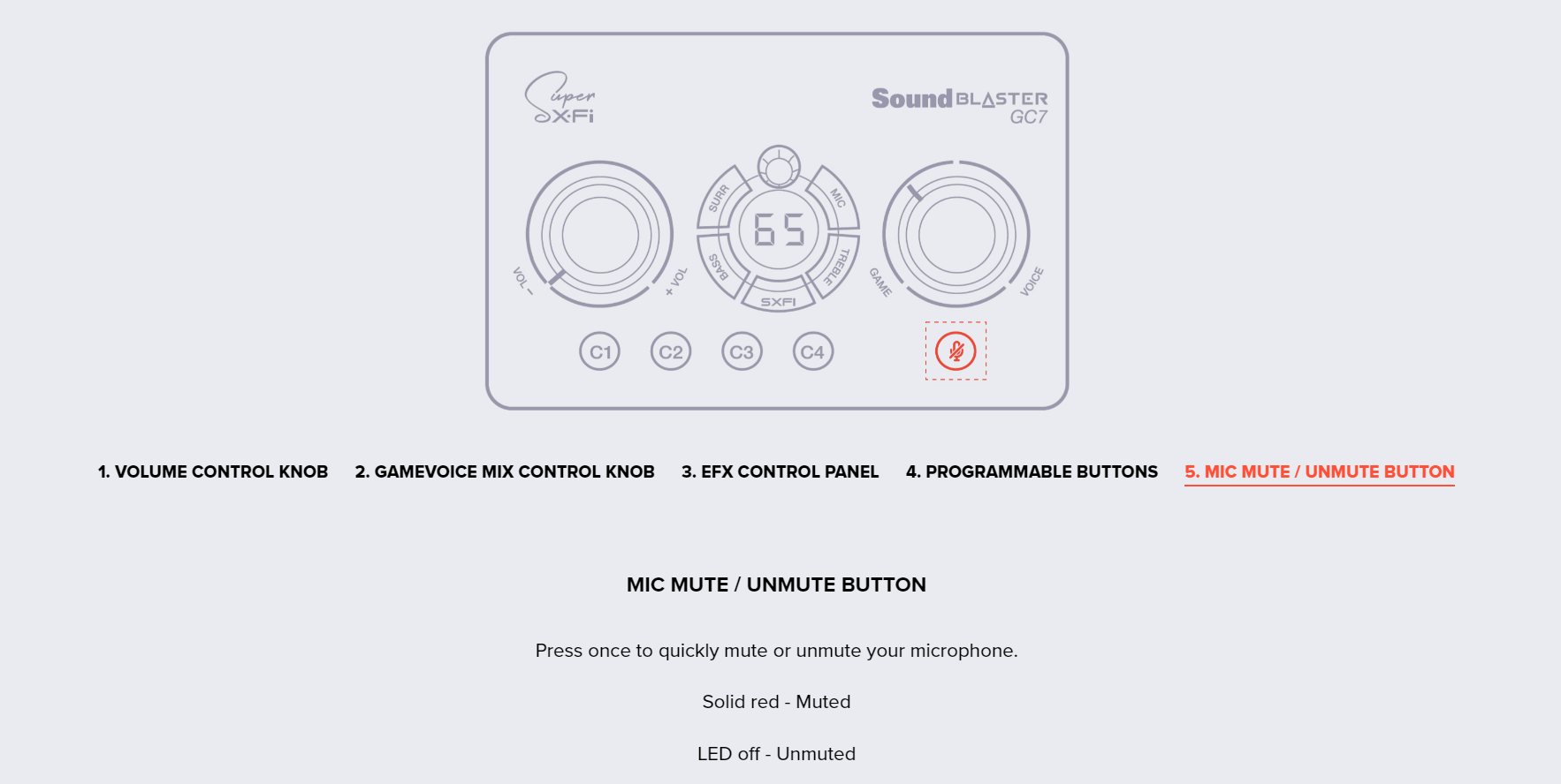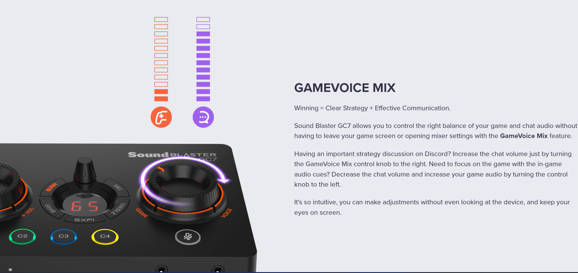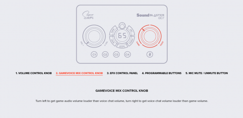 Master volume dial, GameVoice Mix dial, SXFI button, Surround button, Bass button, Treble button, Mic button, Rotary dial, Mic mute / unmute button, Power button, Platform mode switch, Headphone gain switch, 4 Reassignable C1-C4 buttons