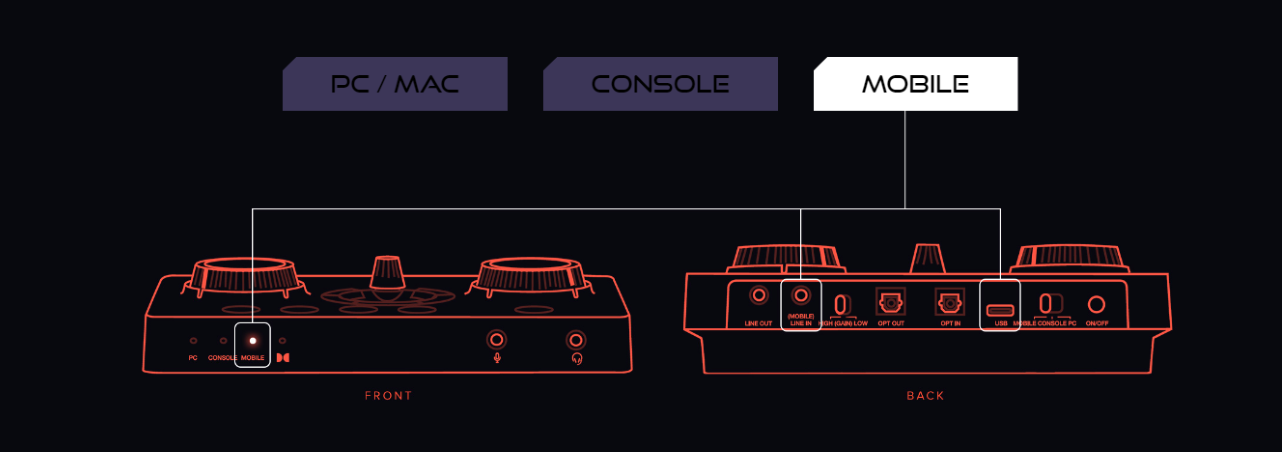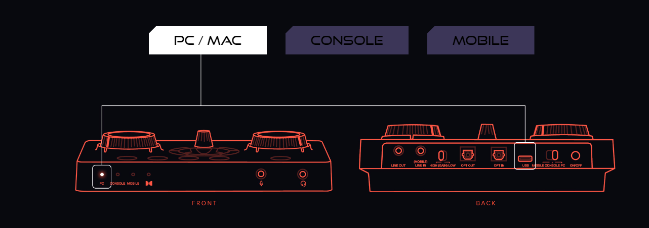 1 x 1/8″ Ext. Mic-in Jack, 1 x 1/8″ Line In / Mobile, 1 x 1/8″ Line Out, 1 x 1/8″ 4-Pole Combo Jack, 1 x SPDIF In, 1 x SPDIF Out, 1 x Type-C port for PC / Mac / Consoles