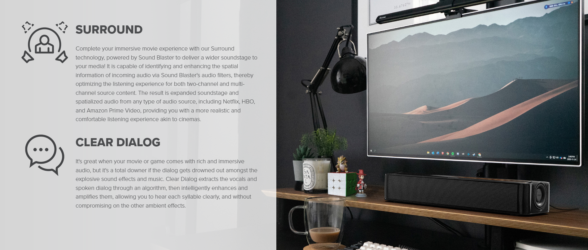 | The Creative Stage SE is armed with Sound Blaster's audio technologies—Clear Dialog and Surround, providing you with improved vocal intelligibility and wide surround experience in an instant. Enjoy a cinema-like experience at the comfort of your own home, and focus on your screen without having to depend on subtitles. |