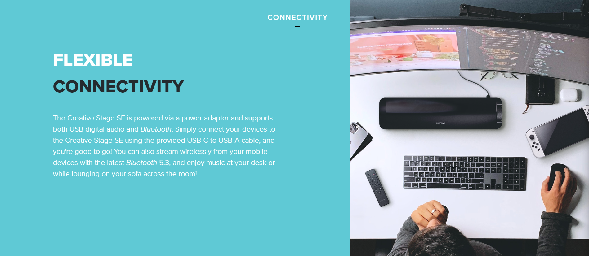 The Creative Stage SE powers up via a power adapter and connects to your computer with a single USB cable or wirelessly with Bluetooth 5.3. Its small footprint also allows for flexible placement under the monitor and well suited for smaller rooms. Plus, the soundbar is easy to set up and control, with the multi-functional knob conveniently located at the side of the soundbar for easy reach to power on or adjust volume.