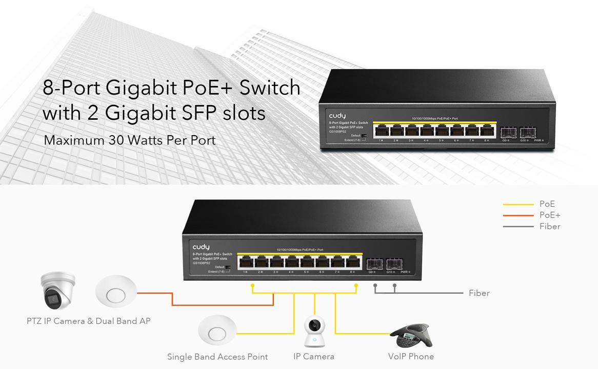 8* Gigabit PoE Ports 2* Gigabit SFP Ports |