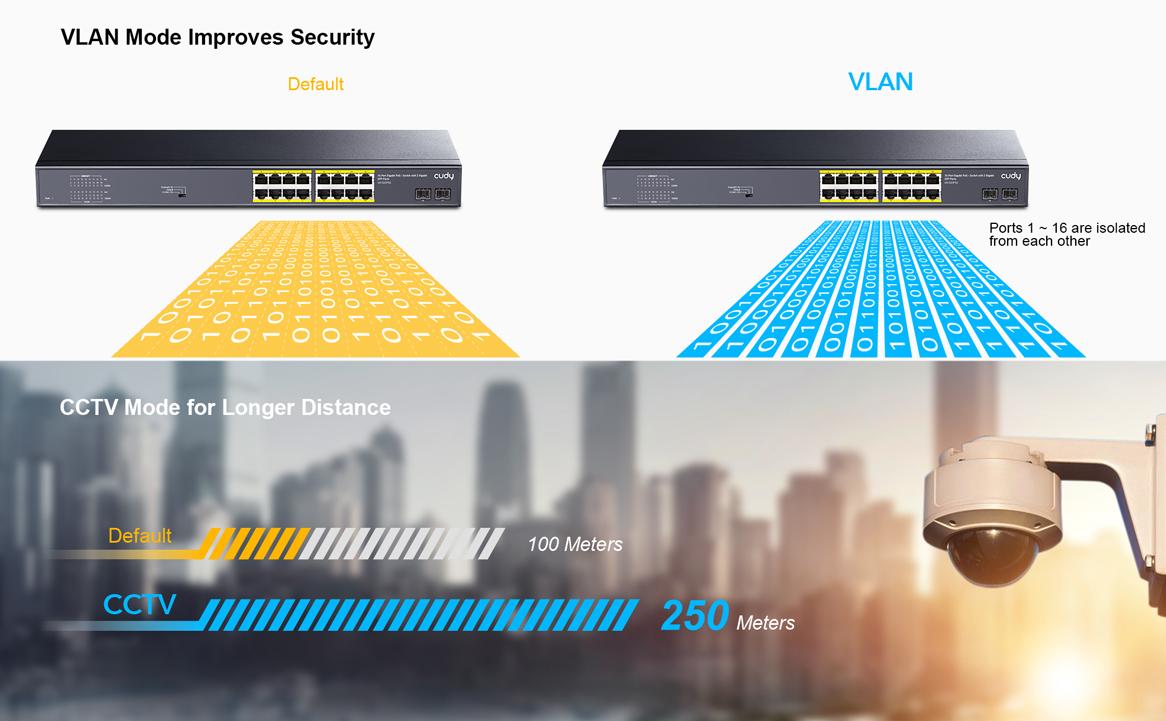 ● Режимът VLAN поддържа 16 POE+ порта, изолирани един от друг