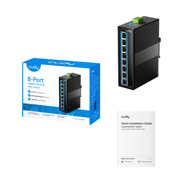 Cudy IG1008P е индустриален 8-портов гигабитен PoE+ суич, проектиран за работа в тежки условия като производство, транспорт, морски и минни среди.