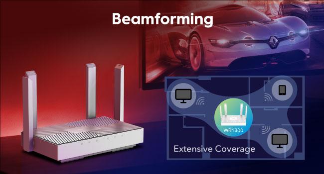 Beamforming detects the direction of connected devices and forms a focused signal towards them to improve coverage