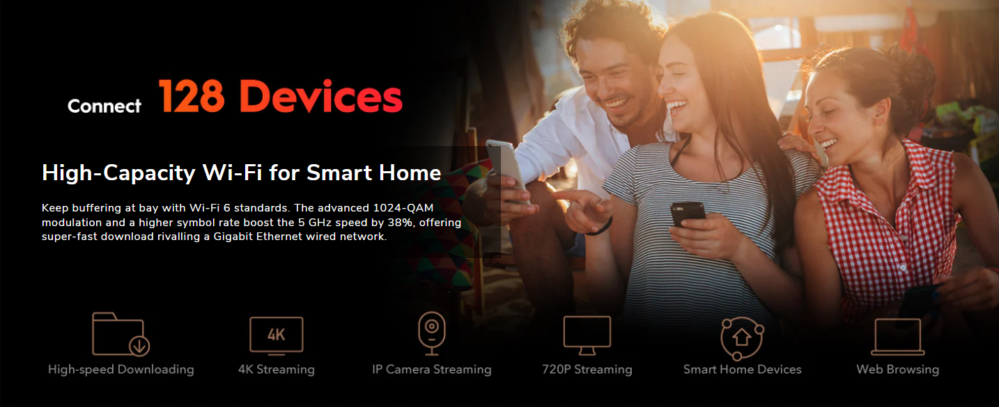 The upgraded Wi-Fi 6 standard features downlink and uplink MU-MIMO and OFDMA, multiplying the network capacity to be more responsive under heavy use.