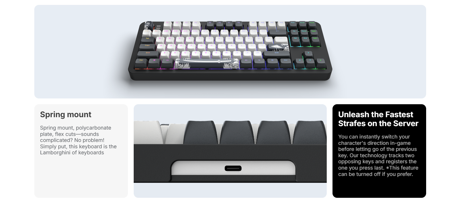| Lighting | Customizable Full RGB | Software | RGB settings, Macros, Key Remapping, Snap Tap |