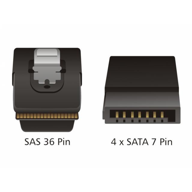This SAS cable by Delock can be used to connect internal SAS devices, e.g. a controller with Mini SAS connector to 4 HDDs with SATA ports.