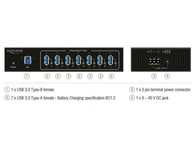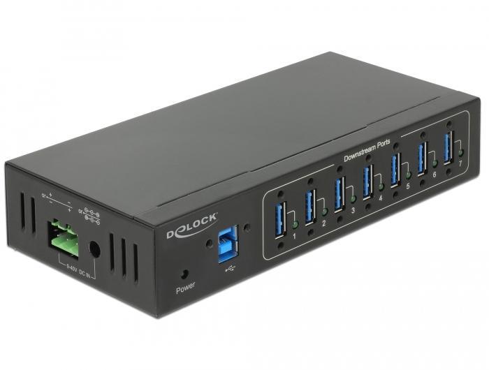 Външен индустриален хъб Delock, 7 x USB 3.0 Type-A с 15 kV ESD защита, 9–40V DC жак