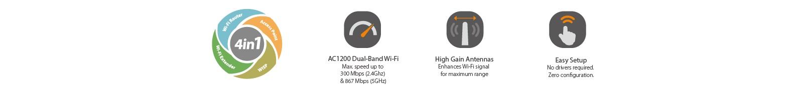- Режим 4 в 1: рутер, точка за достъп, Wi-Fi усилвател и WISP.
