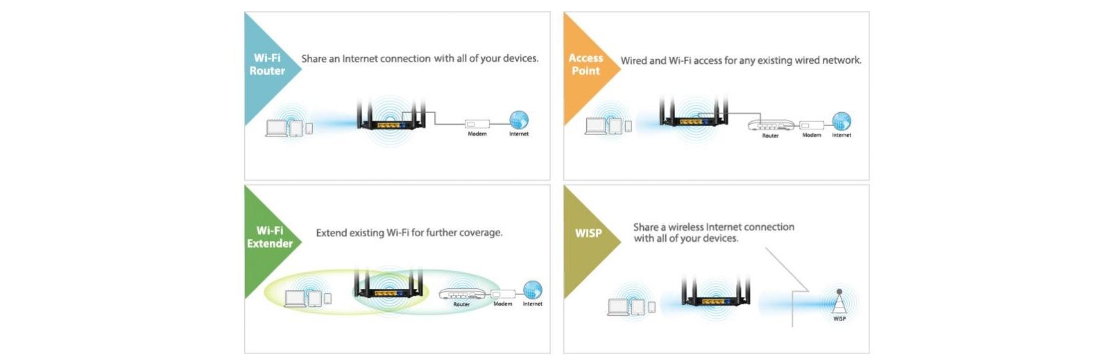 The BR-6476AC can work as 4 major modes for wireless networking, including router, access point, range extender, and WISP modes. You can use it as a router for