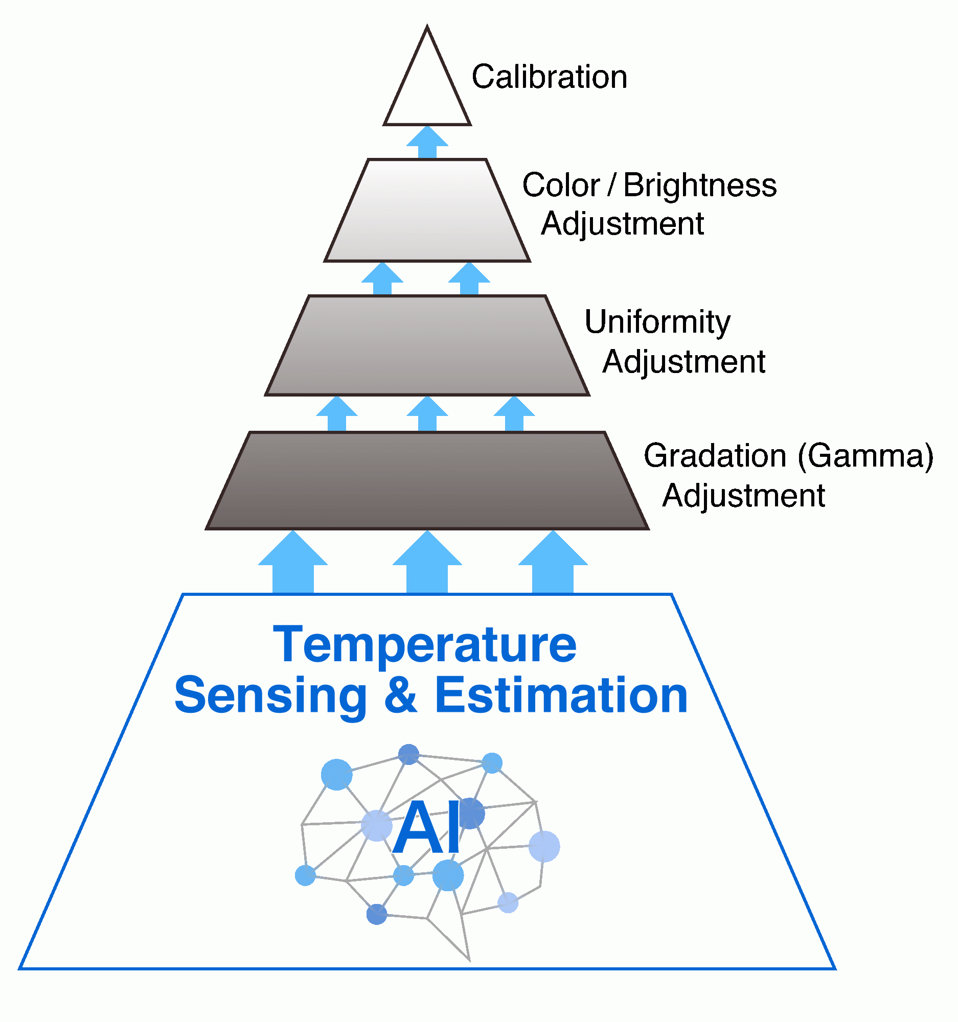 The color and brightness of an LCD monitor can shift due to changes in ambient temperature and the temperature of the monitor itself. ColorEdge CG Series monitors are equipped with a temperature sensor for accurately measuring the temperature inside the monitor, as well as estimating the temperature of the surrounding environment. With this temperature sensing and estimation technology, the monitor adjusts in real-time so gradations, color, brightness, and other characteristics continue to be displayed accurately. Furthermore, EIZO uses AI (artificial intelligence)* in the estimation algorithm of the CG2700X so it can distinguish between various temperature changing patterns to calculate even more accurate correction.