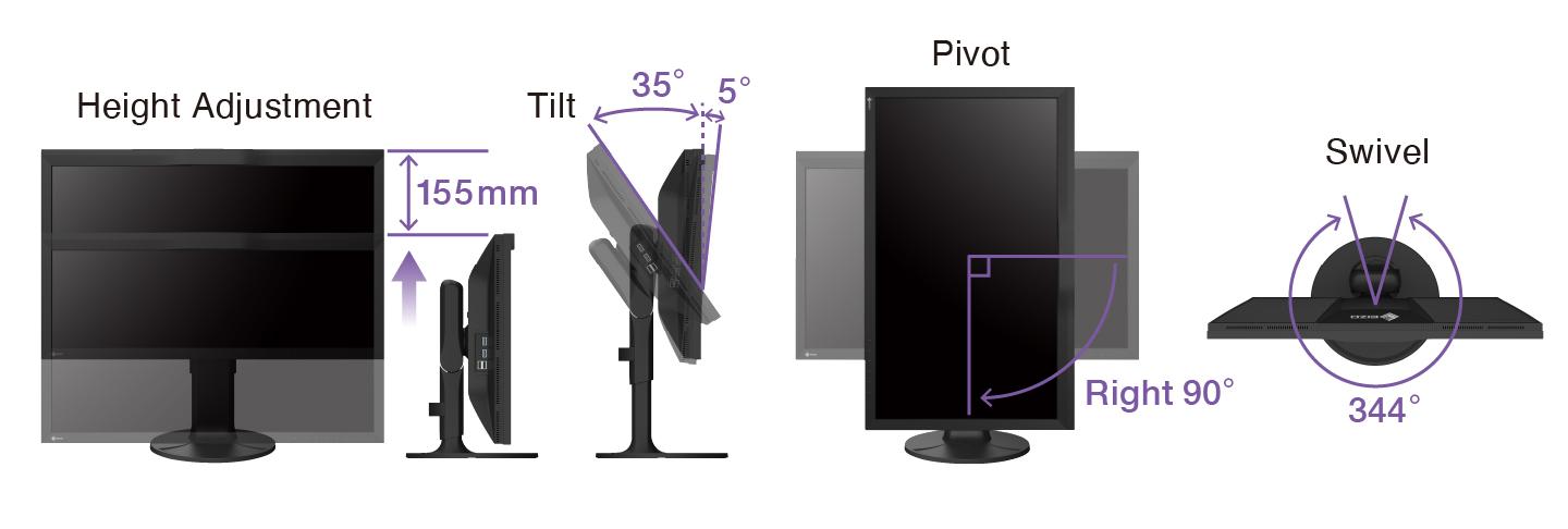 | Input Terminals | USB Type-C (DisplayPort Alt Mode, HDCP 2.3), DisplayPort (HDCP 2.3), HDMI (Deep Color, HDCP 2.3) | Swivel | 344° | |