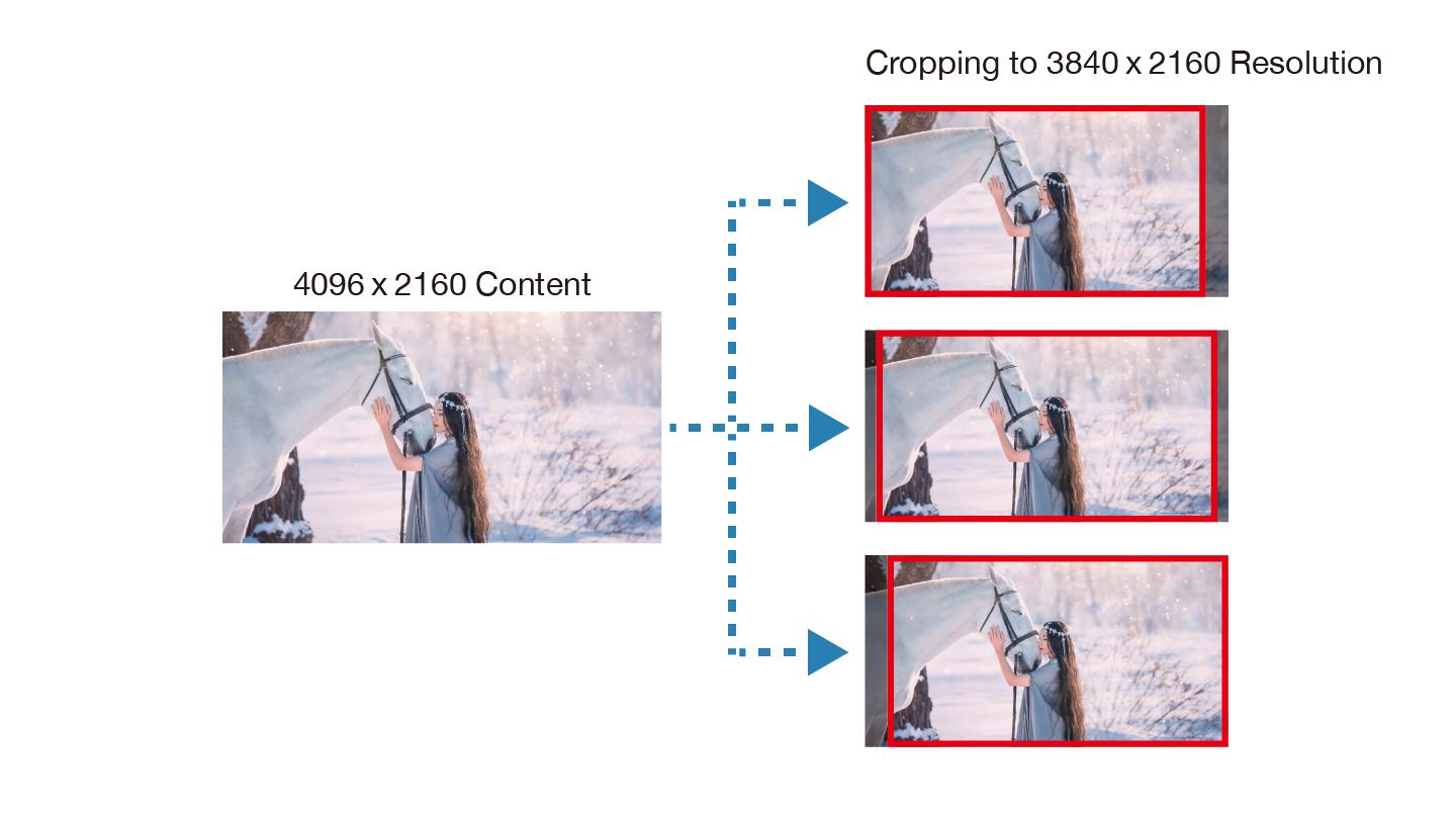 The DCI 4K Cropping function allows the user to display a DCI 4K (4096 x 2160) signal and crop content outside the bounds of the panel's native 4K UHD (3840 x 2160) resolution. Users can select from three options that determines which part of the image is cropped.