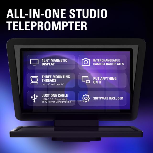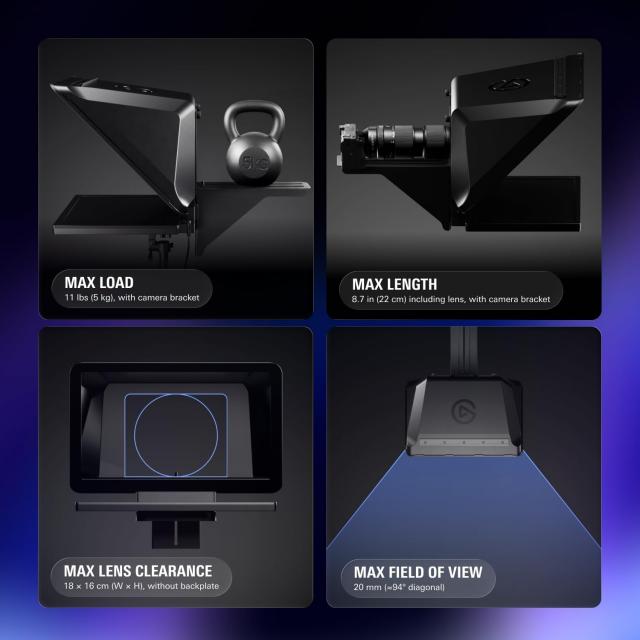Elgato Prompter XL е премиум, голям формат автокю система, създадена за професионални студиа, стриймъри, преподаватели и презентатори, които се нуждаят от кристално чист контакт с аудиторията и безупречно изчитане на текст. Със своя 18.5-инчов дисплей, висококачествено beam splitter стъкло и широка съвместимост с камери, тя осигурява излъчване на професионално ниво и лесна интеграция в съществуващи конфигурации.