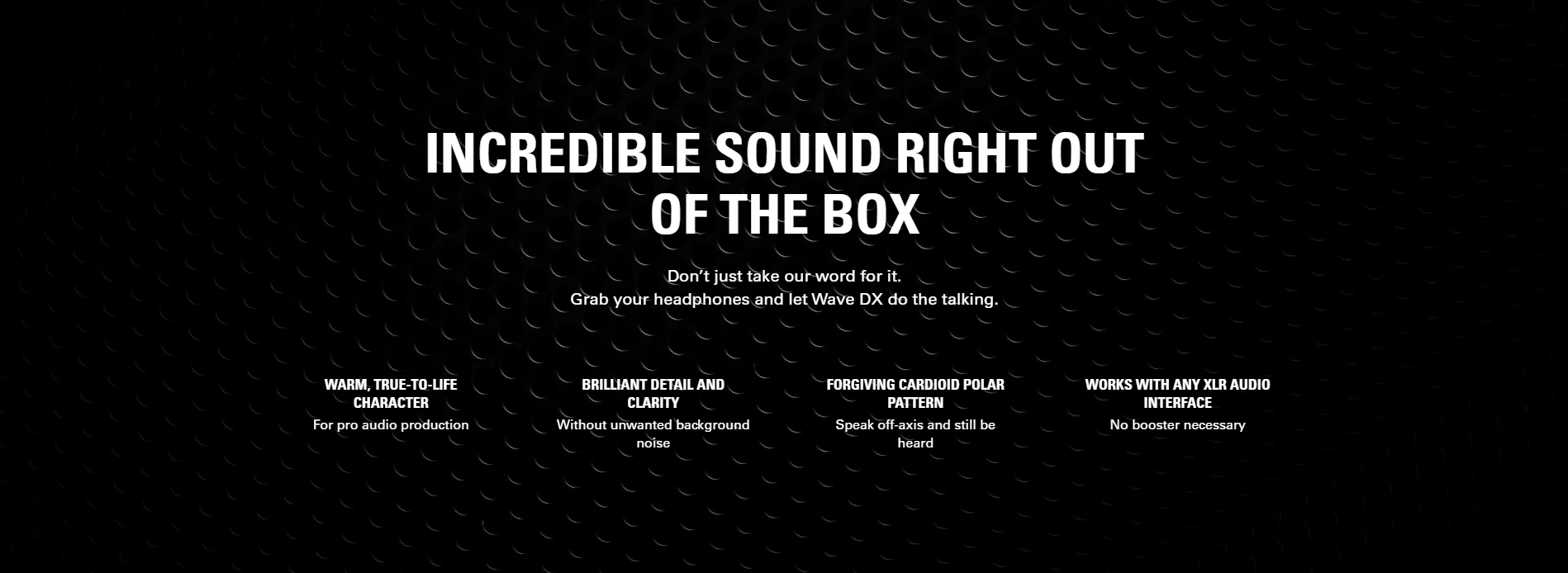 | CONNECTOR | 3-pin XLR | IN THE BOX | Wave DX, Swivel Mount, 3/8" and 1/4" Thread Adapters, Quick Start Guide SKU: 10MAH9901 |