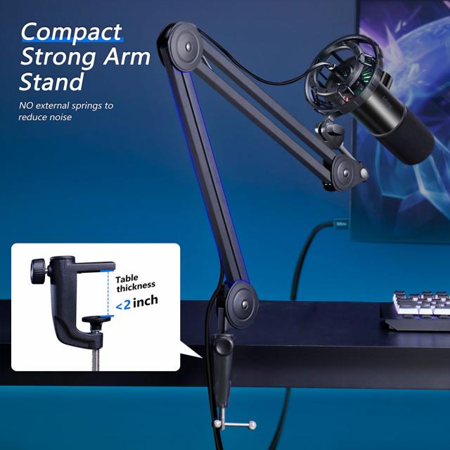 Комплектът FIFINE T658 включва издръжлив shock mount, регулируемо рамо за гъвкаво позициониране, висококачествен USB кабел с дължина 200 см и адаптер от 3/8 към 5/8 инча, съвместим с повечето стандартни стойки. Този пълен комплект осигурява стабилност и лесно позициониране, като минимизира шума от боравене и гарантира ясен звук при стрийминг, подкасти или видео продукция.