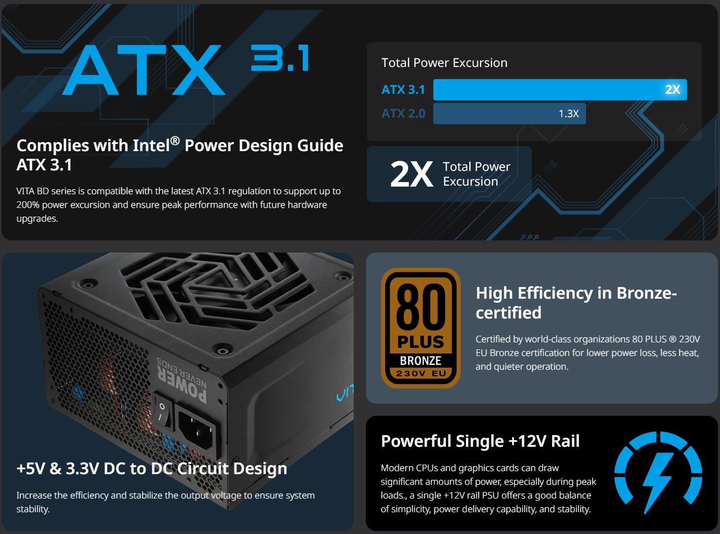 | Form Factor | ATX12V V3.1 | Fan Type | Sleeve Bearing, 120mm |