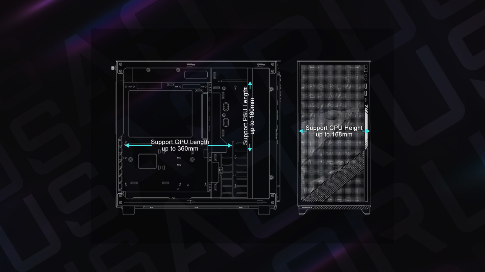 | Dimensions | H435x W210x D469 mm (Within ± 1% error) | Maximum Compatibility | CPU Height : 168mm GPU Length : 360mm PSU Length : 160mm |