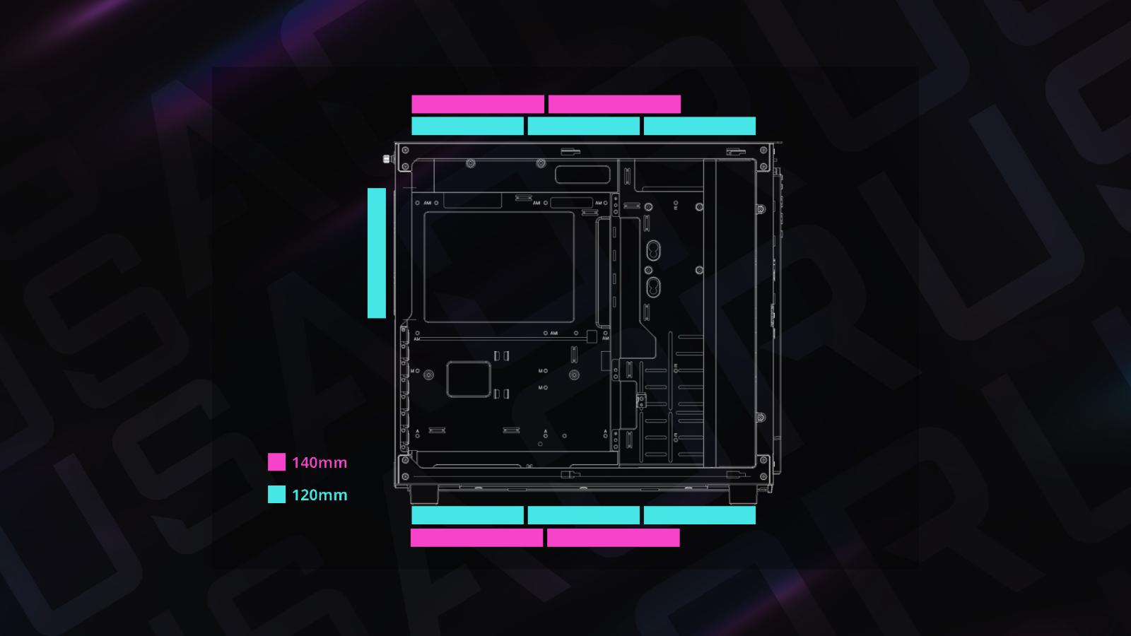| Case Form Factor | Mid Tower | Fan Support | Bottom : 120mm x3 / 140mm x2 Top : 120mm x3 / 140mm x2 Rear : 120mm x1 |