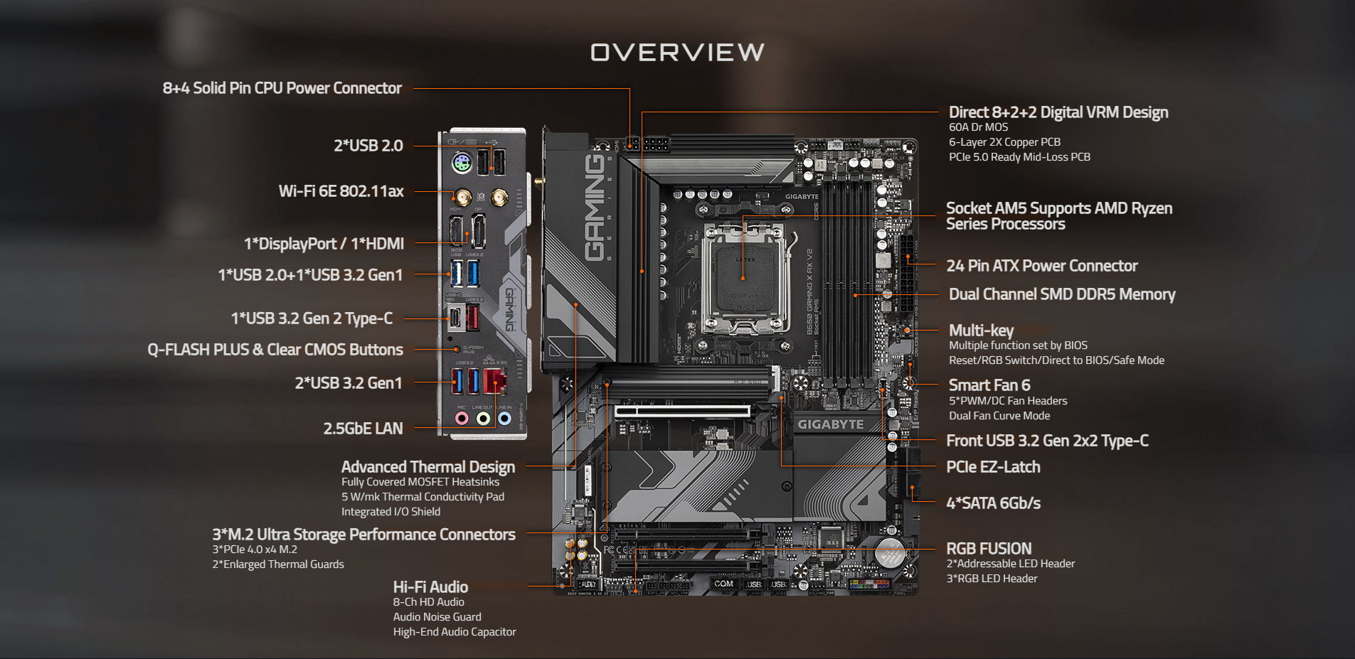 - AMD Socket AM5, support for: AMD Ryzen 7000 / Ryzen 8000 / Ryzen 9000 Series Processors