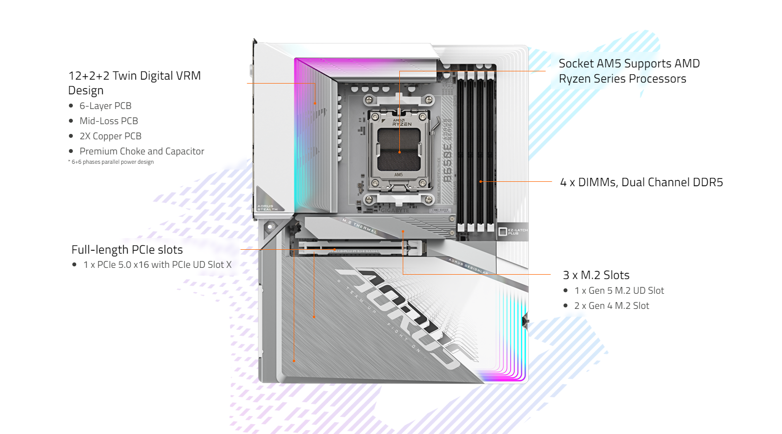 - AMD Socket AM5:Supports AMD Ryzen 9000/8000/ 7000 Series Processors