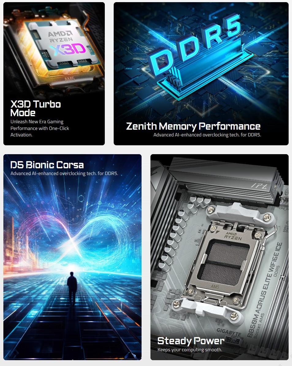 | CPU | AMD Socket AM5, support for: AMD Ryzen 9000 Series Processors/ AMD Ryzen 8000 Series Processors/ AMD Ryzen 7000 Series Processors (Go to GIGABYTE's website for the latest CPU support list.) |