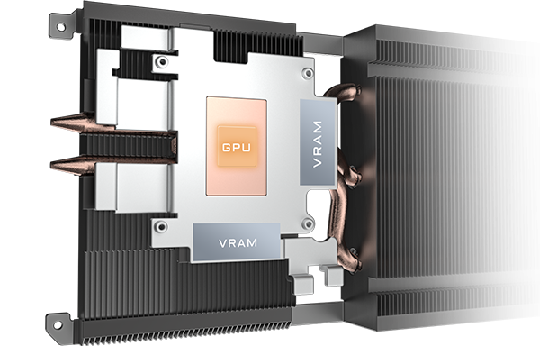 The copper plate directly contacts the GPU, coupled with the composite copper heat pipes, which quickly transfers the heat of the GPU and VRAM to the heatsink.