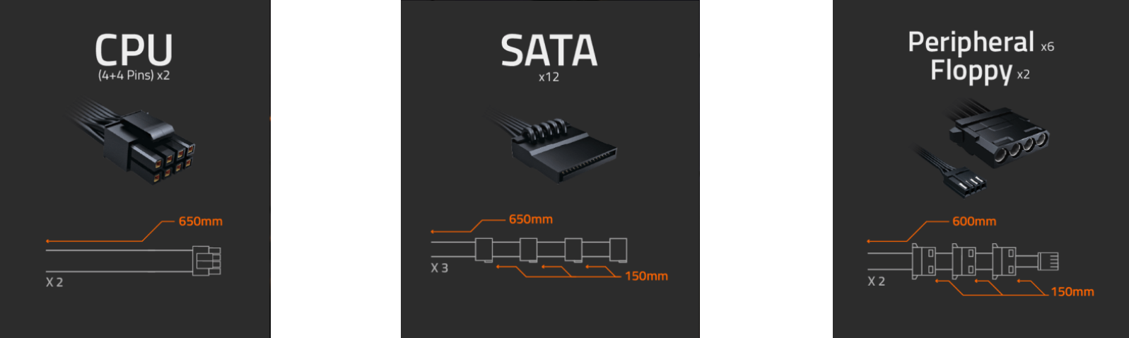 ATX/MB 20+4 Pin x 1 : 610mm*1 CPU/EPS 4+4 Pin x 2 : 650mm*2 PCIe 16 Pin x 1: 700mm*1 PCIe 6+2 Pin x 8 : 650mm+150mm*3, 650mm*2 SATA x 12 : 650mm+150mm+150mm+150mm*3 4 Pin Peripheral x 6+4-Pin floppy x 2 : 600mm+150mm+150mm+150mm*2 |