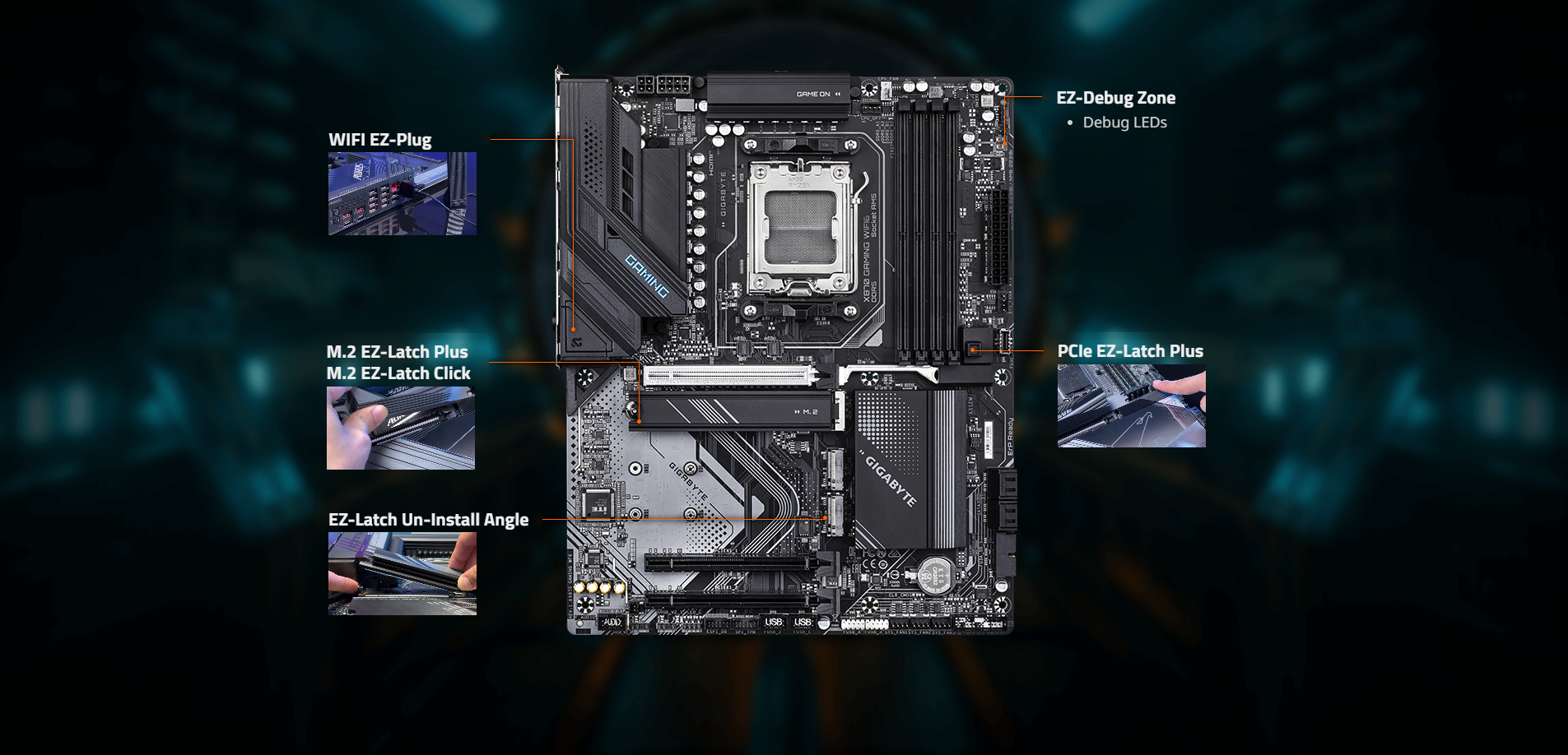 • EZ-Latch Plus:PCIe and M.2 slots with Quick Release & Screwless Design