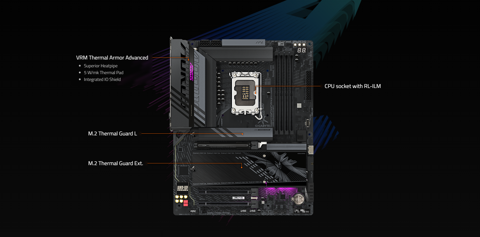 • Efficient Thermal : VRM Thermal Armor Advanced & M.2 Thermal Guard