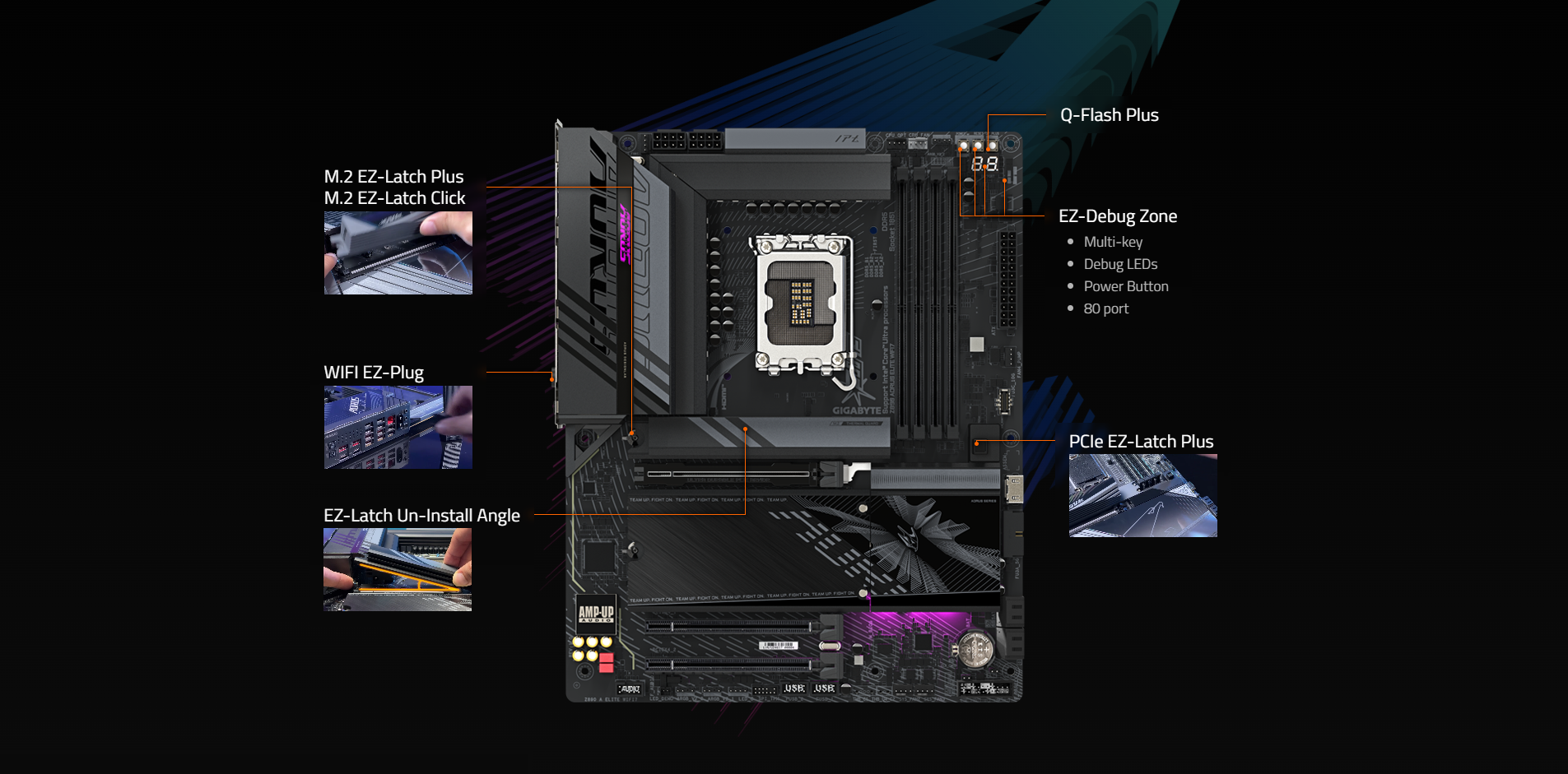 • EZ-Latch Plus : PCIe and M.2 slots with Quick Release & Screwless Design
