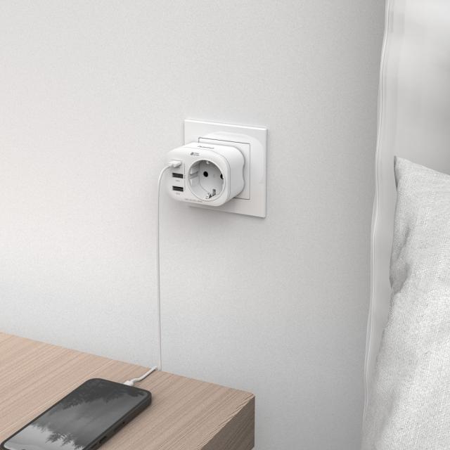 Компактен адаптер с множество гнезда без кабели: просто включете в съществуващия контакт и незабавно преобразувайте една връзка в четири - давайки на електрическите устройства допълнителни възможности за свързване и зареждане с USB-C, USB-A и заземен контакт