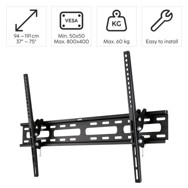 | Hole size attachment | up to M8 | Screen size | 94cm (37"), 97cm (38"), 99cm (39"), 102cm (40"), 104cm (41"), 107cm (42"), 109cm (43"), 112 cm (44"), 114 cm (45"), 117 cm (46"), 119 cm (47"), 122 cm (48"), 123 cm (49"), 127 cm (50"), 129 cm (51"), 132cm (52"), 137cm (54"), 140cm (55"), 147cm (58"), 152cm (60"), 163cm (64"), 165cm ( 65"), 178cm (70"), 191cm (75") |