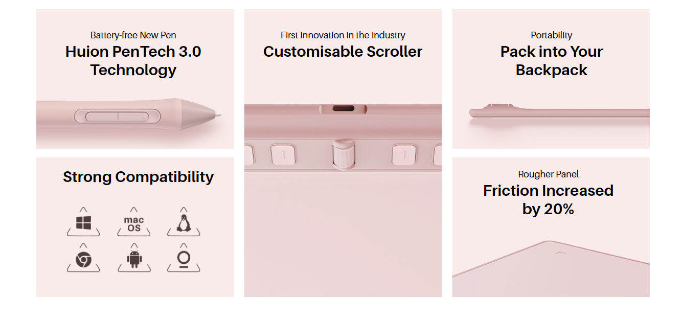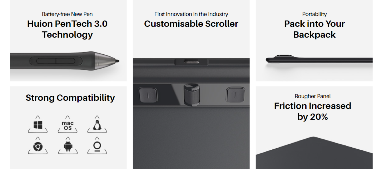 Inspiroy 2 narrows its width and keeps the overall thickness to less than 1cm, allowing you to easily pack the tablet into your backpack for drawing on the go. More importantly, the thinner body reduces wrist discomfort when creating. |