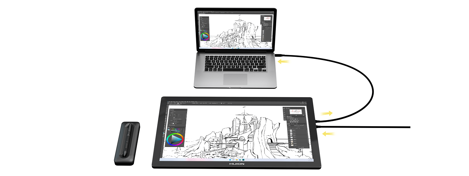 Kamvas Pro 19 provides two blind-mate USB-C ports, allowing you to quickly connect your laptop using the full-featured cable.