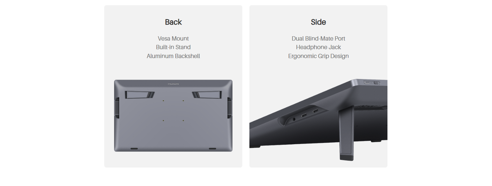 Kamvas Pro 19 is optimized from ports to stand. The VESA mount facilitates the transition from portability to desktop use. Blind-